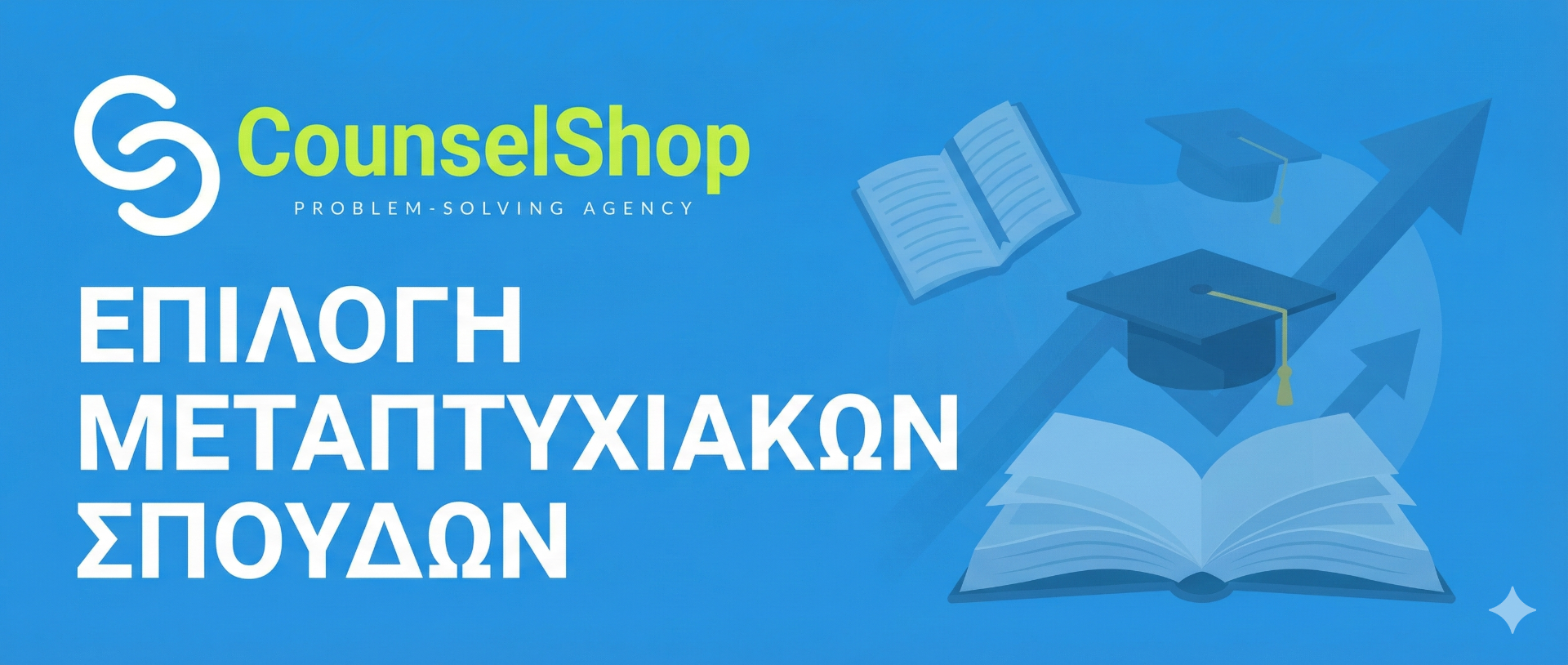 Οι σύμβουλοι του CounselShop.gr είναι δίπλα σου για να σε καθοδηγήσουν στη σωστή επιλογή μεταπτυχιακού προγράμματος, με βάση τα ενδιαφέροντα και τους στόχους σου.