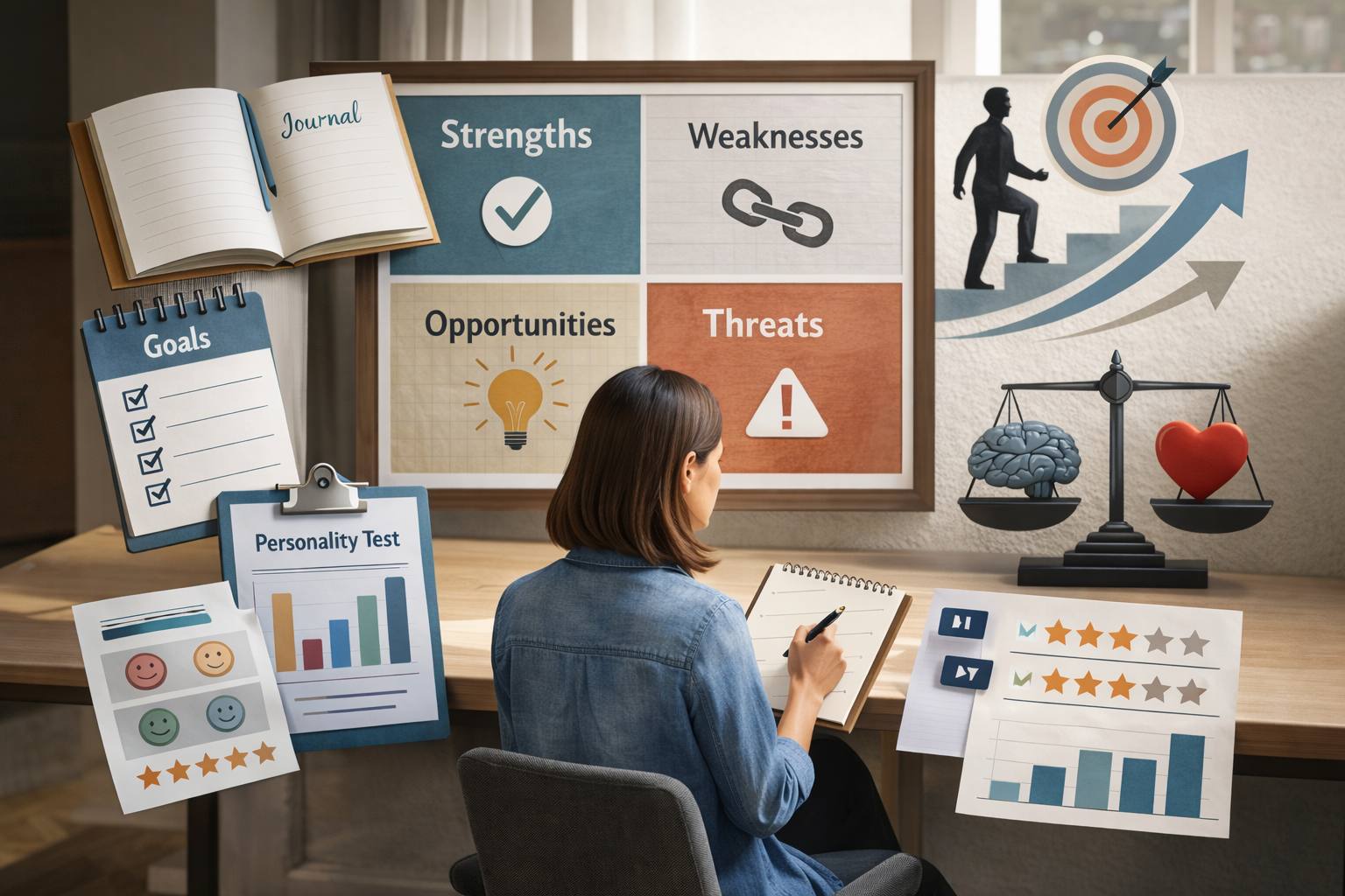 Η καταγραφή σκέψεων, συναισθημάτων και εμπειριών είναι ένα από τα πιο ισχυρά εργαλεία αυτοαξιολόγησης. Δεν χρειάζεται να είναι λογοτεχνικό αριστούργημα. Απλά γράψτε ελεύθερα, απαντώντας σε ερωτήσεις όπως: