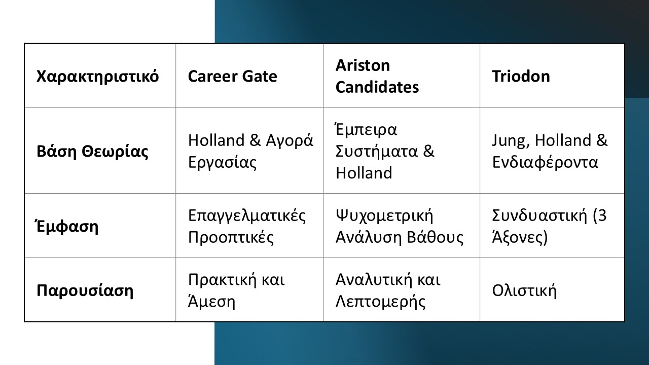 Το Πλεονέκτημα: Η λεπτομέρεια. Δεν μένει μόνο στα επαγγέλματα, αλλά αναλύει σε βάθος την προσωπικότητα, την αυτοεκτίμηση και την έδρα ελέγχου (Locus of Control).