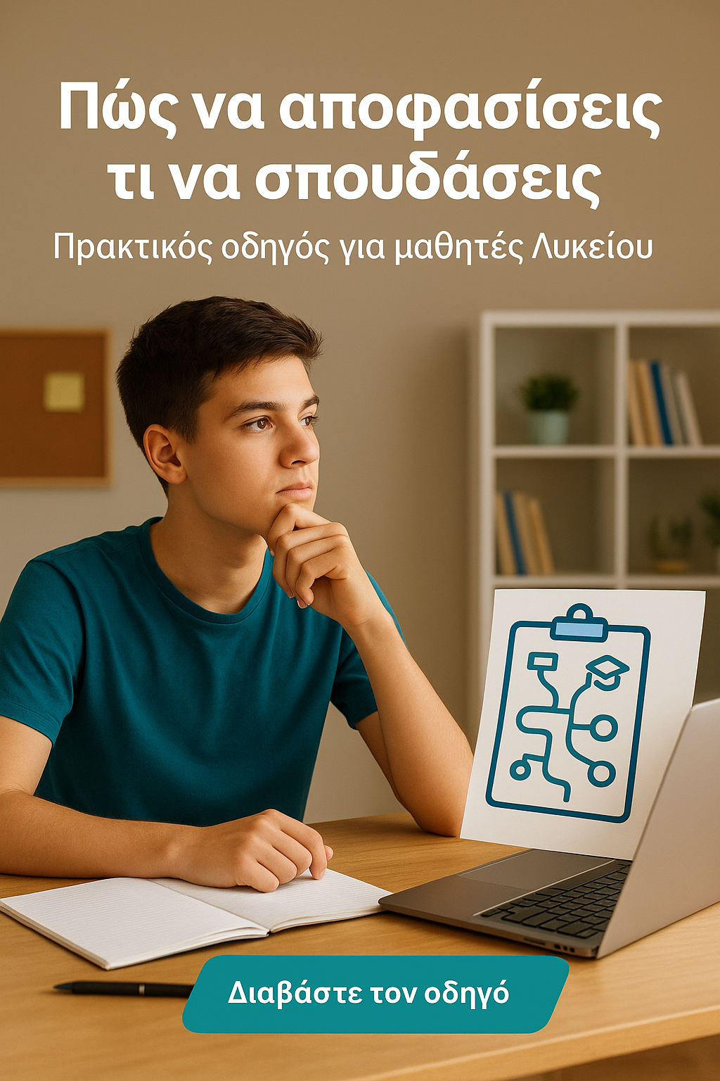 Η επιλογή σπουδών αποτελεί μία από τις πιο κρίσιμες αποφάσεις στην πορεία ενός μαθητή, όχι επειδή καθορίζει «για πάντα» το μέλλον, αλλά επειδή θέτει τις πρώτες βάσεις για το επόμενο βήμα μετά το σχολείο. Πολλοί μαθητές αισθάνονται πίεση, σύγχυση ή άγχος. Άλλοι γνωρίζουν τι τους αρέσει, αλλά δεν ξέρουν πώς να το μετατρέψουν σε πραγματικές επιλογές...