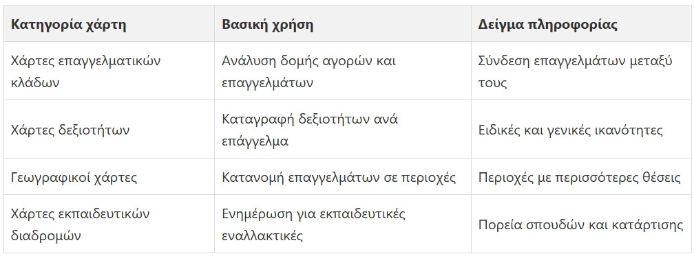 - Χάρτες επαγγελματικών κλάδων: Απεικονίζουν την δομή και τις προοπτικές διαφορετικών επαγγελμάτων
