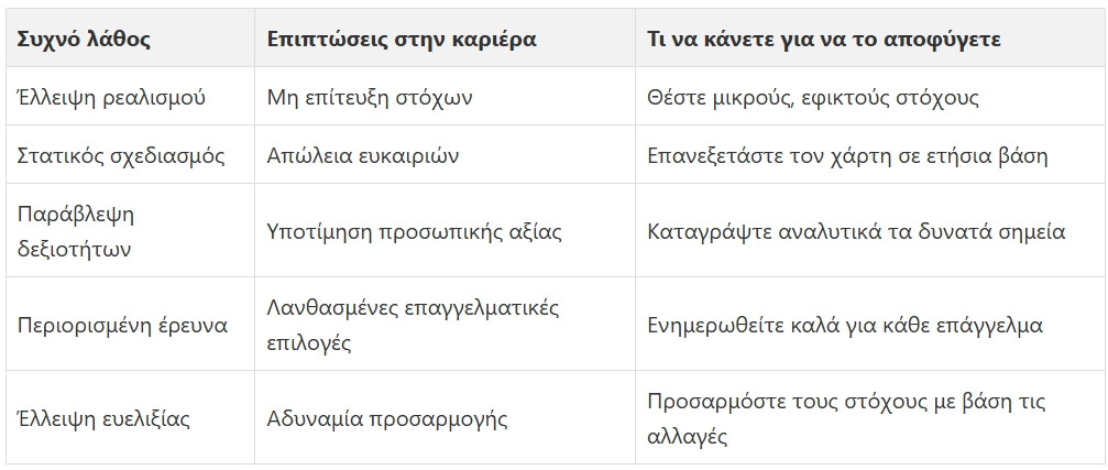 Ο επαγγελματικός χάρτης απαιτεί προσεκτικό σχεδιασμό και αποφυγή συνηθισμένων παγίδων. Επαγγελματικά λάθη μπορούν να υπονομεύσουν σημαντικά τις επαγγελματικές προοπτικές και να οδηγήσουν σε λανθασμένες επιλογές.
